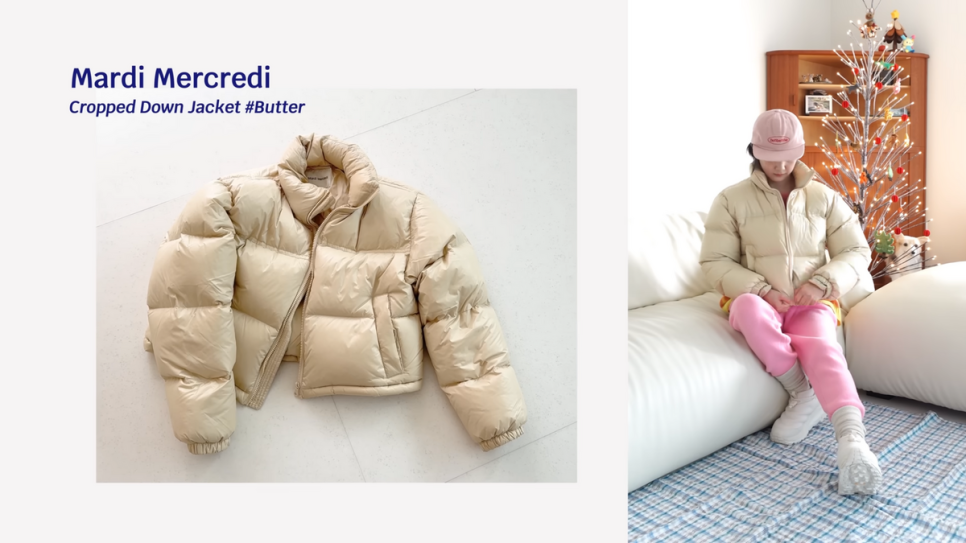 윤승아가 강아지와 산책하러 나갈 때마다 입는다는 마르디 메르크디의 크롭 다운 재킷이에요. 따뜻하고 부드러운 버터 컬러가 포인트입니다. 짧은 기장이어서 다리가 더 길어보이고 휘뚜루마뚜루 입기 좋아요. (이전에 에디터가 한 번 추천했던 패딩인 건 안 비밀 -! ✌🏼 안유진 패딩 마르디 메크르디 패딩 바로가기)