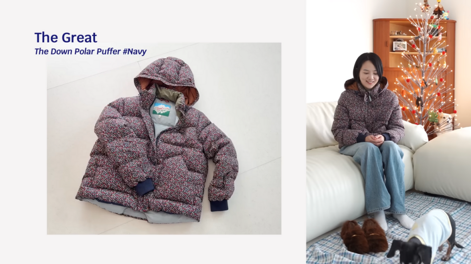 첫 번째로 소개한 제품은 잔잔한 꽃무늬가 돋보이는 더 그레이트의 패딩 점퍼입니다. 안 입은 것 같은 가벼운 무게와 독특하고 사랑스러운 프린터까지! 실용성과 개성을 모두 가졌네요.