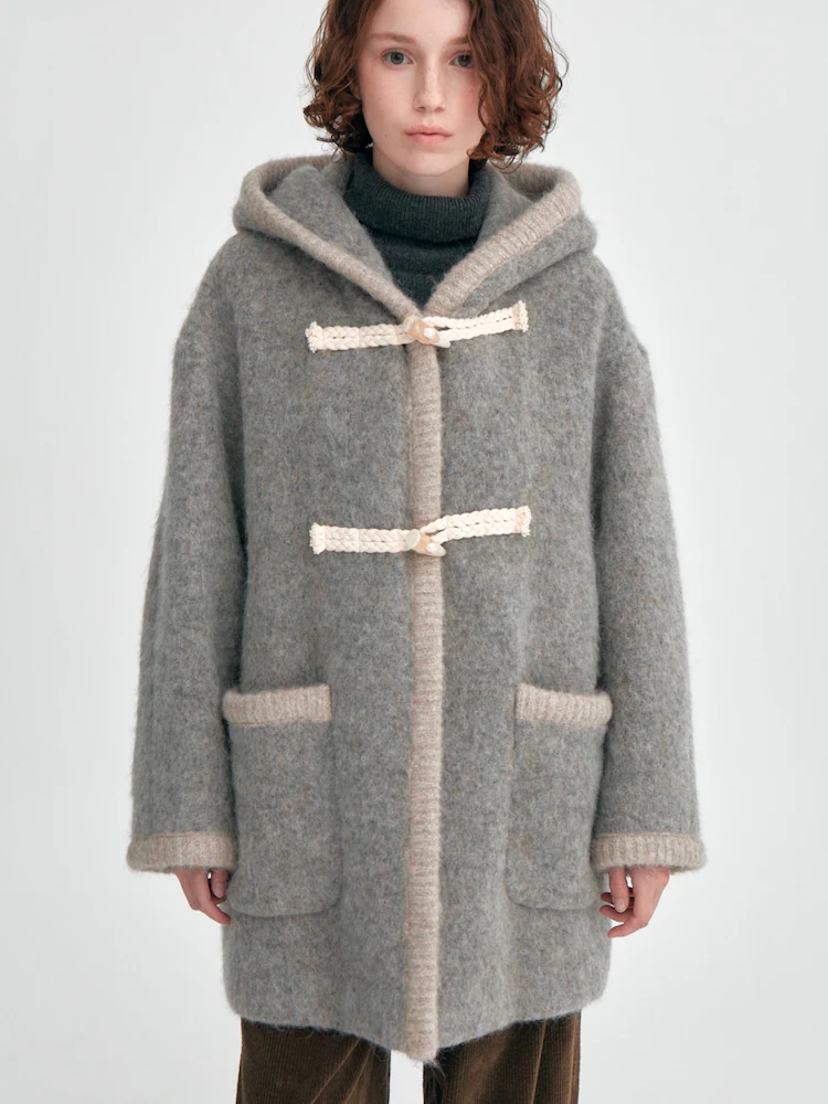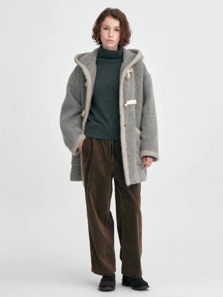 그녀가 착용한 코트는 비이커 오리지날의 ‘Women Volume Sleeve Duffle Coat’입니다. 중앙에 크게 들어가 있는 두 개의 토글 단추 디테일이 단번에 더플코트임을 알려주고 있죠. 또한 주머니, 소매, 후드 등의 가장자리에 들어간 아이보리 배색 포인트도 눈에 띄는 디테일인데요, 해당 코트의 디자인상 특별함을 더욱 살려주는 요소입니다.