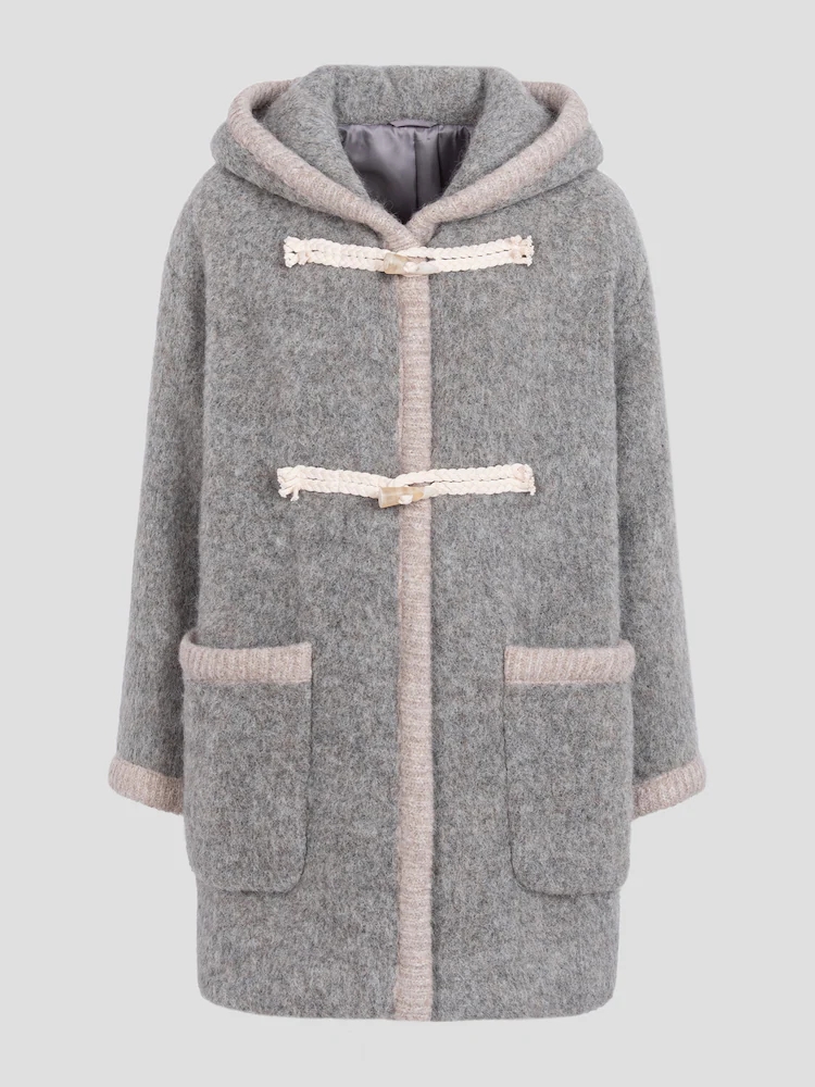 그녀가 착용한 코트는 비이커 오리지날의 ‘Women Volume Sleeve Duffle Coat’입니다. 중앙에 크게 들어가 있는 두 개의 토글 단추 디테일이 단번에 더플코트임을 알려주고 있죠. 또한 주머니, 소매, 후드 등의 가장자리에 들어간 아이보리 배색 포인트도 눈에 띄는 디테일인데요, 해당 코트의 디자인상 특별함을 더욱 살려주는 요소입니다.