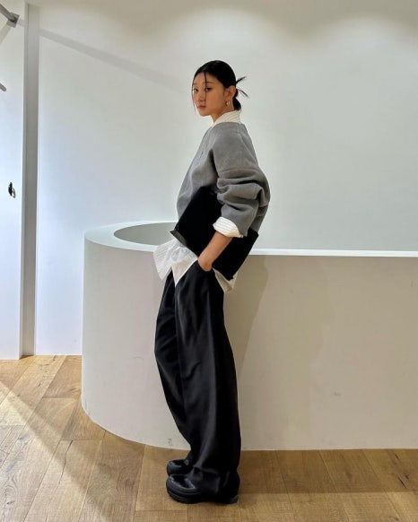살짝 캐주얼한 무드의 비즈니스 코어룩을 완성하고 싶다면 셔츠에 심플한 니트나 카디건을 레이어드 해 보는 것도 좋다. 모델 여연희는 자연스러운 주름이 매력적인 테일러드 팬츠에 오버사이즈 스트라이프 셔츠와 그레이 니트 톱을 더해 전체적으로 여유로운 느낌의 룩을 선보였다. 이처럼 여유로운 실루엣은 비즈니스 코어만의 중성적인 매력을 극대화 해준다.
