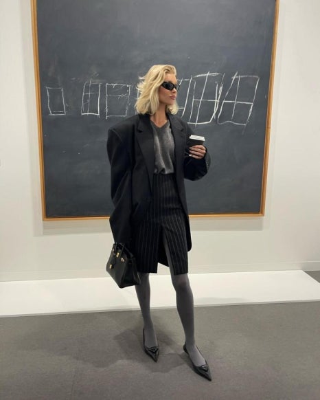 캐주얼한 옷차림에도 자켓과 팬츠를 더하면 금새 오피스 무드로 변신한다. 세계적인 모델, 엘사 호스크는 어깨를 강조한 오버사이즈 테일러드 재킷을 활용해 시니컬한 비즈니스 코어 룩을 선보였다. 마치 1980년대 레트로한 스타일이 떠오르는 핀 스트라이프 스커트에 포인티드 토 키튼 힐로 스타일을 완성한 것.