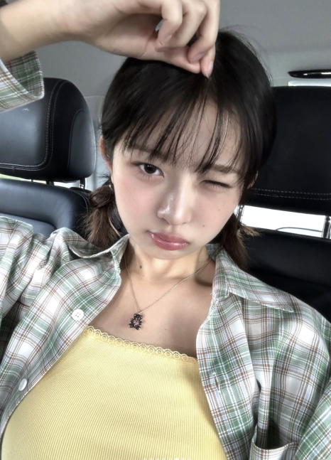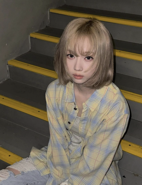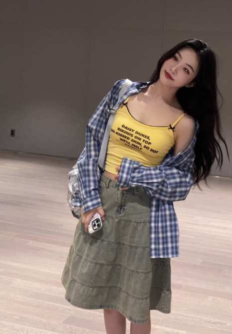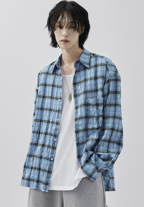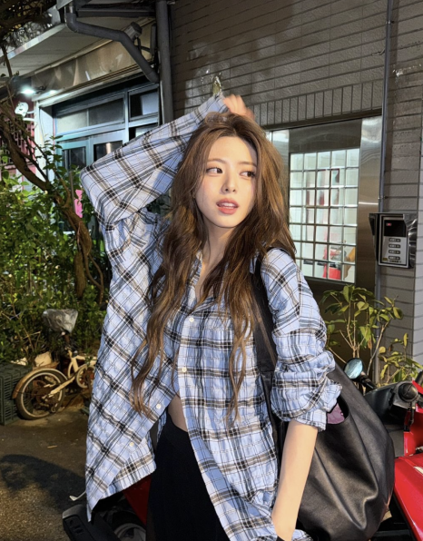 있지의 유나는 시원한 느낌의 블루 색깔의 체크 셔츠를 착용한 일상 사진을 공개하였습니다. 얇고 주름진 텍스처로 가볍고 편안해 보이는 느낌을 주고 있는 셔츠죠.