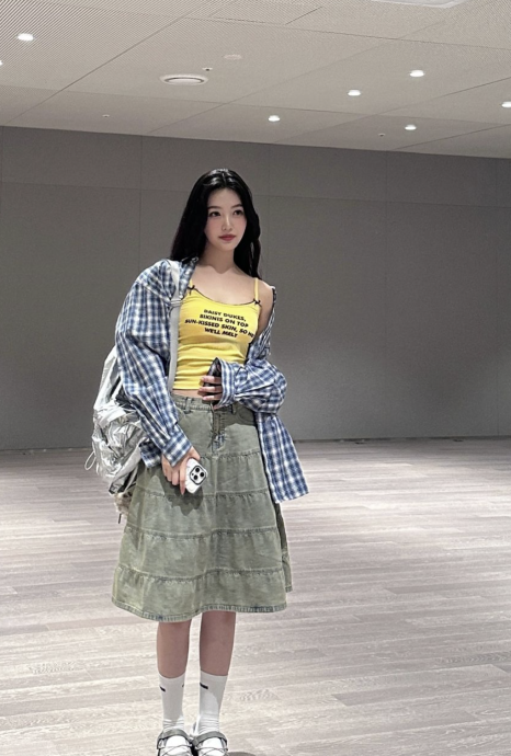 아이브 레이의 놀이동산 룩 제품, 셋업이엑스이의 OVER CHECK SHIRT입니다. 해당 제품의 핑크색 모델은 카리나가 공항룩으로 착용하기도 하여 한번 바이럴 되었던 제품인데요, 레이는 그린 색상을 선택한 모습이죠.