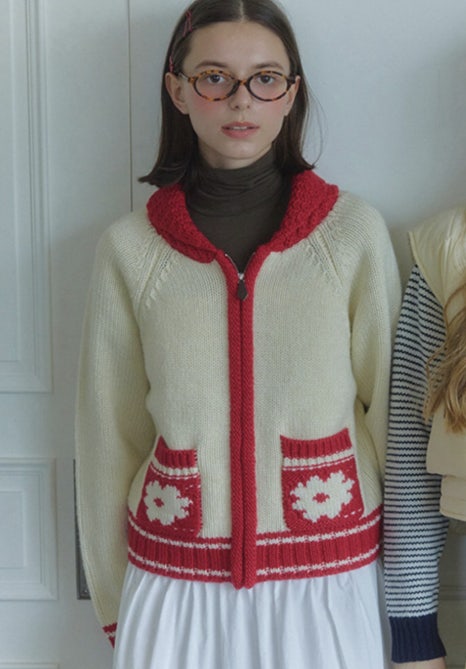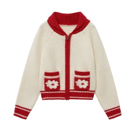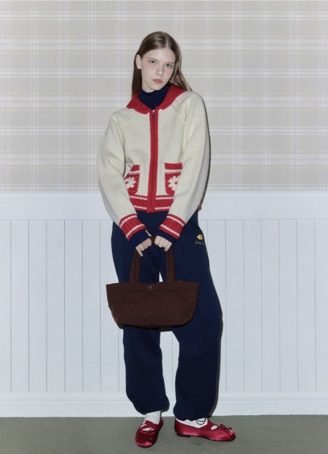 아이보리 색상 바탕에 빨간 배색 포인트들이 들어가 있어 더욱 러블리하고 유니크한 분위기가 살아나는 코지 가디건, 저는 개인적으로 레트로한 느낌이 나면서도 말량광이 삐삐 캐릭터가 생각나기도 하는 것 같아요:)