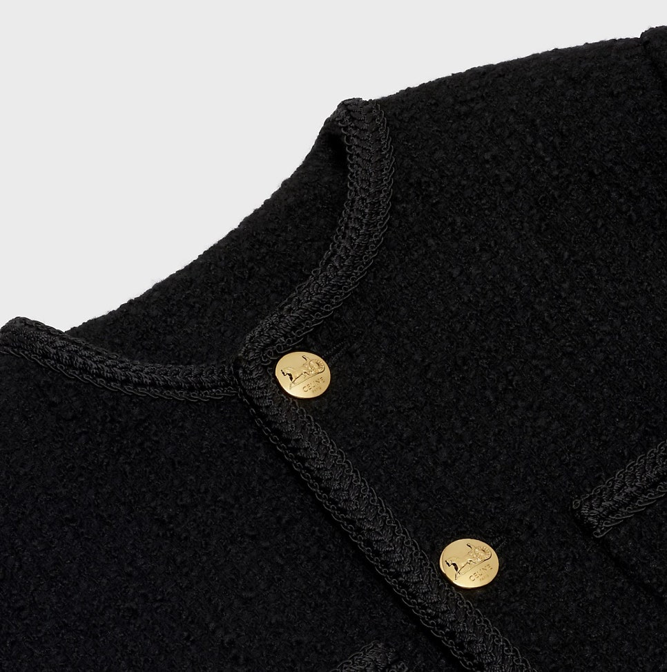 특히 재킷 전체를 따라 이어지는 브레이디드 파이핑 디테일은 구조적인 라인을 강조하면서도 고급스러운 분위기를 더해줘서 정말 눈에 띄죠? 중앙의 세 개 골드 버튼은 셀린느 특유의 단정한 화려함을 잘 담아내고 있고요. 커프스에 배치된 골드 버튼은 손목을 움직일 때마다 은근하게 반짝여서 전체 실루엣을 한층 더 완성도 있게 만들어 주는 것 같아요. ✨