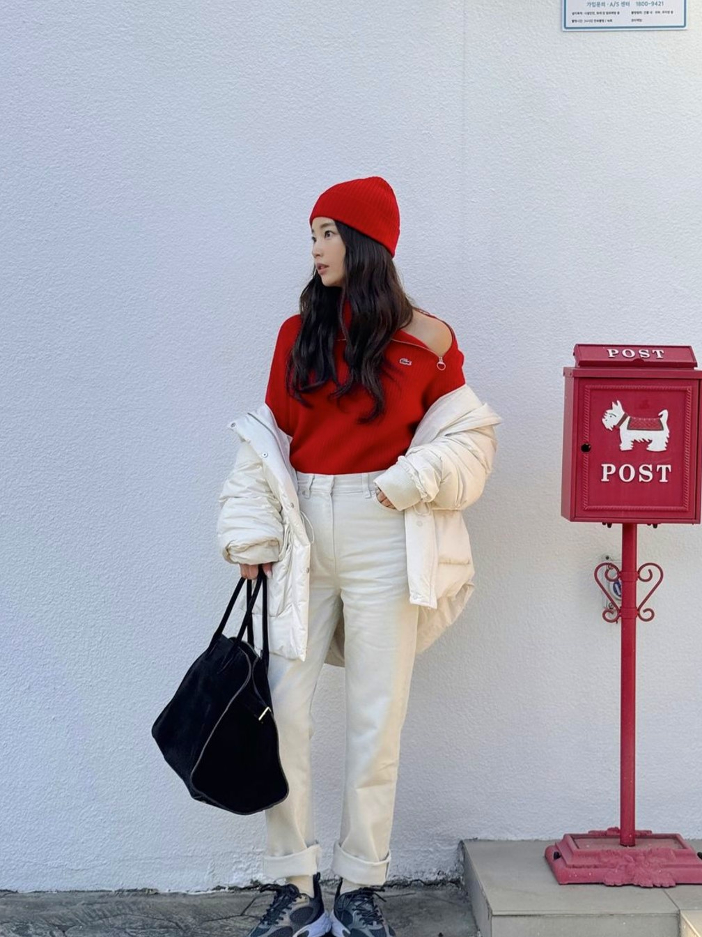 사복 장인이라 불리는 패션리더 기은세, 그녀는 레드 트렌드에 발맞추어 쨍한 빨강이 포인트가 되는 코디를 보여주었습니다. 유니크한 디자인의 상의와 화사함이 돋보이는 패딩, 비니와 신발까지!