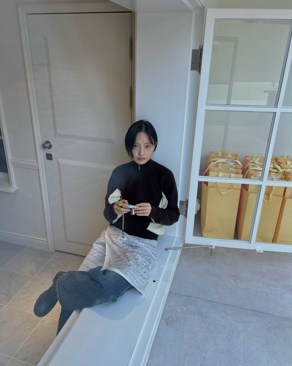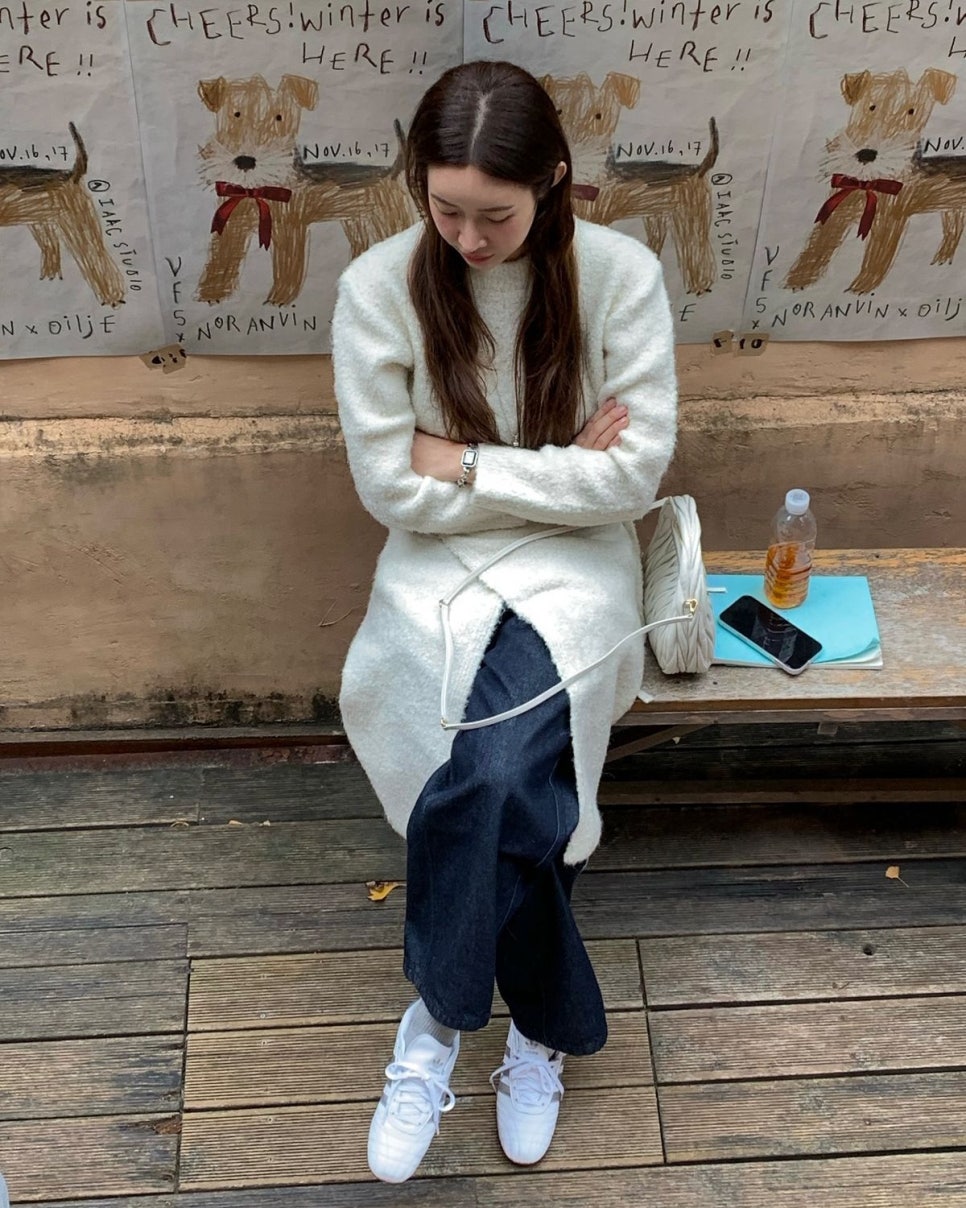 먼저 스타일의 아이콘 차정원의 룩부터 볼까요? 데님 위에 보송보송한 니트 소재의 랩 스커트를 덧입었는데요, 같은 화이트 컬러 계열로 니트, 스니커즈를 선택한 덕분에 전혀 과하지 않고 세련된 무드의 스타일링이 완성됐어요. 화이트 레이어드 스커트 덕분에 귀여운 느낌까지 주네요.