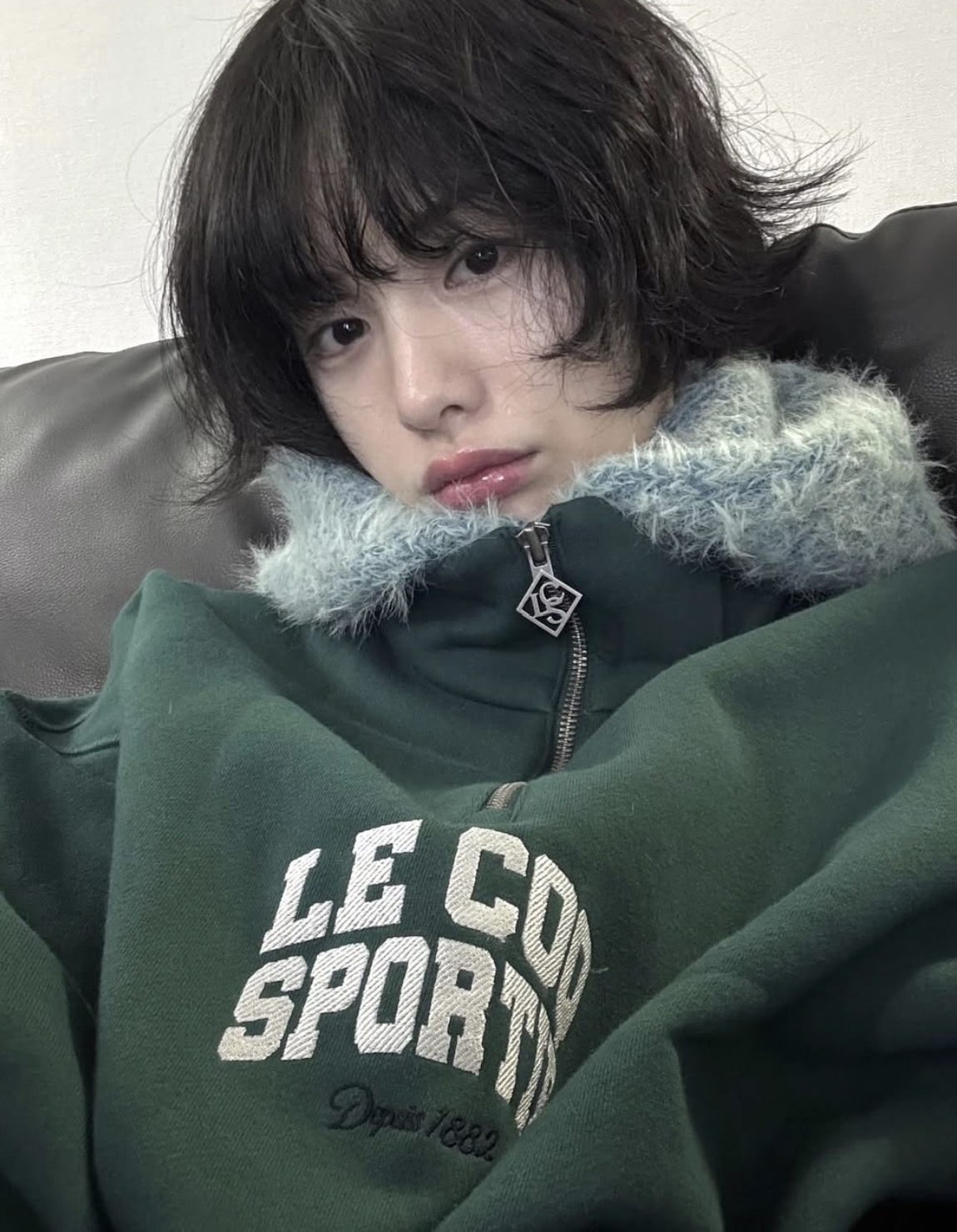 나나의 사진 속 가장 눈에 띄었던 반집업 아이템, 르꼬끄의 ‘하프 집업 기모 맨투맨’입니다.