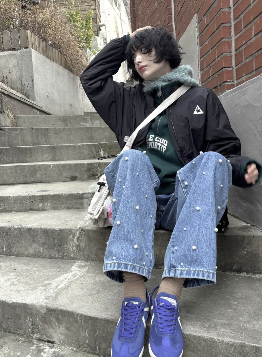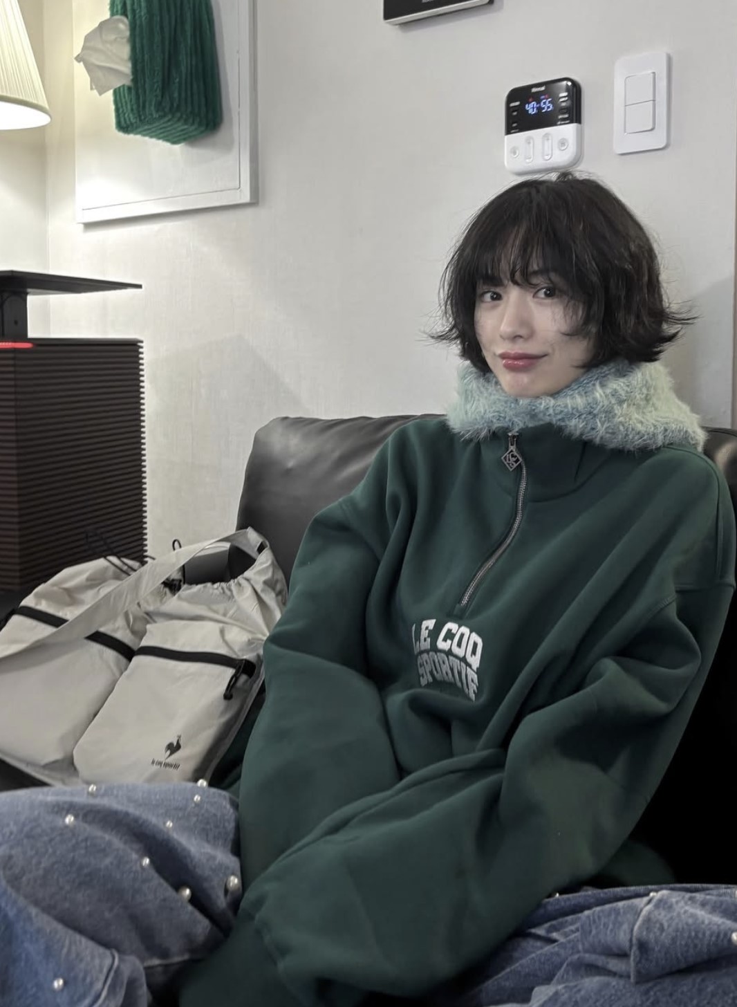 나나의 사진 속 가장 눈에 띄었던 반집업 아이템, 르꼬끄의 ‘하프 집업 기모 맨투맨’입니다.