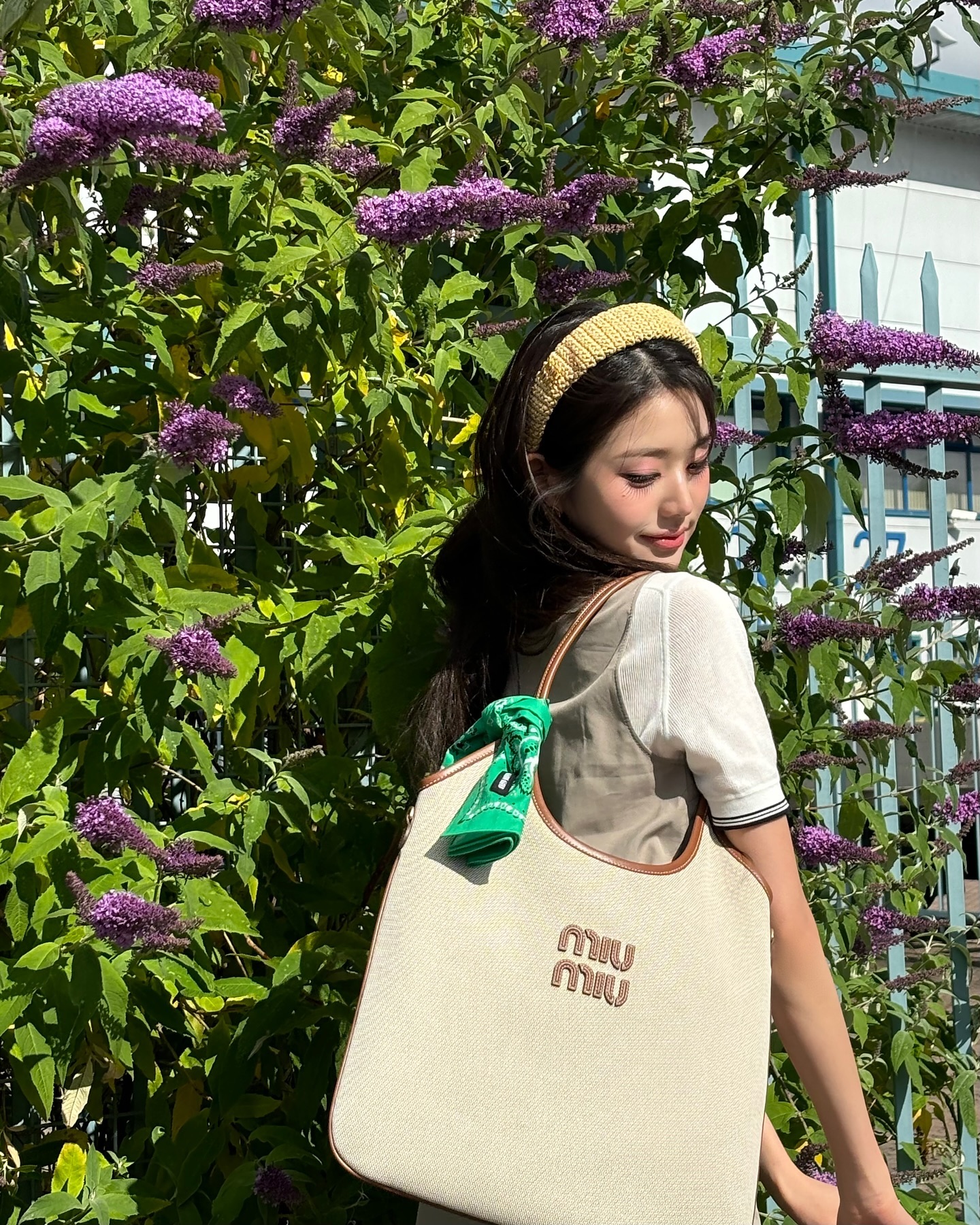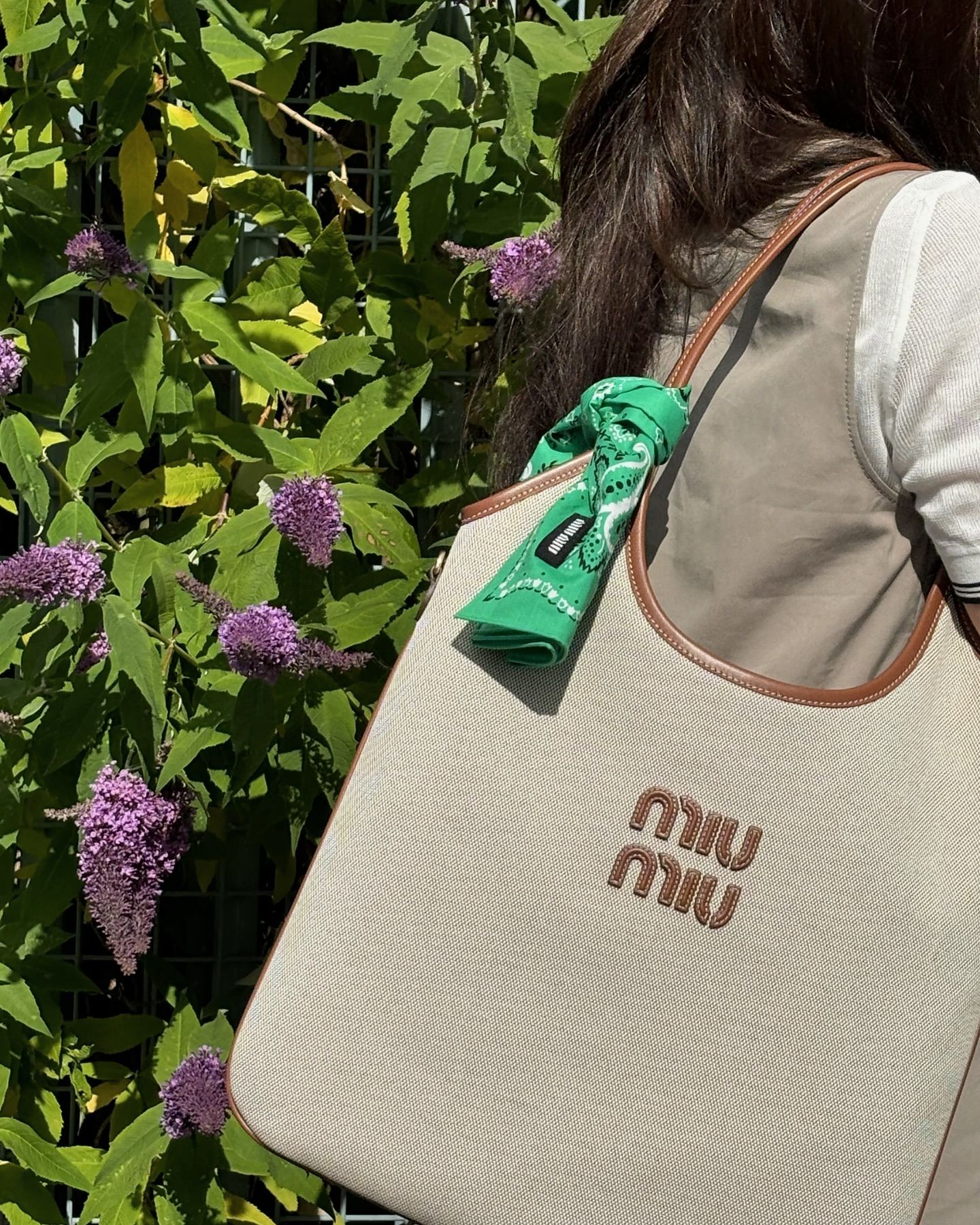 다른 캔버스백에 비해 미우미우 아이비 캔버스 백은 핸들이 매우 슬림하게 디자인되어 있는데요. 때문에 토트백으로 활용 시, 몸에 착 달라 붙어 더욱 멋스러운 스타일링이 가능해요. 장원영 인스타 속 스타일링 처럼, 이 캔버스 백에 귀여운 스카프를 매치하는 것도 좋은 방법이겠네요! 코디에 참고하시면 좋을 것 같아요.