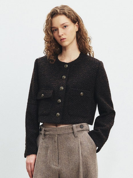 일상룩에도, 오피스룩에도 찰떡인 트위드 크롭 자켓! 이세영은 와이드 블랙 슬랙스와 매치해서 입었는데요, 쿨하고 멋있는 스타일이 되었어요. 슬랙스뿐만 아니라 블랙진이나 데님진과 매치해도 예쁠 재킷이에요. 블랙처럼 보이지만 짙은 고동색이 더욱 고급스러워 보입니다.