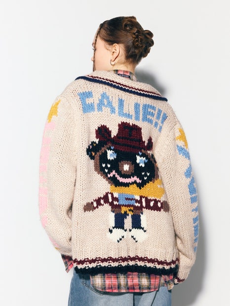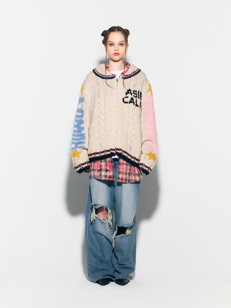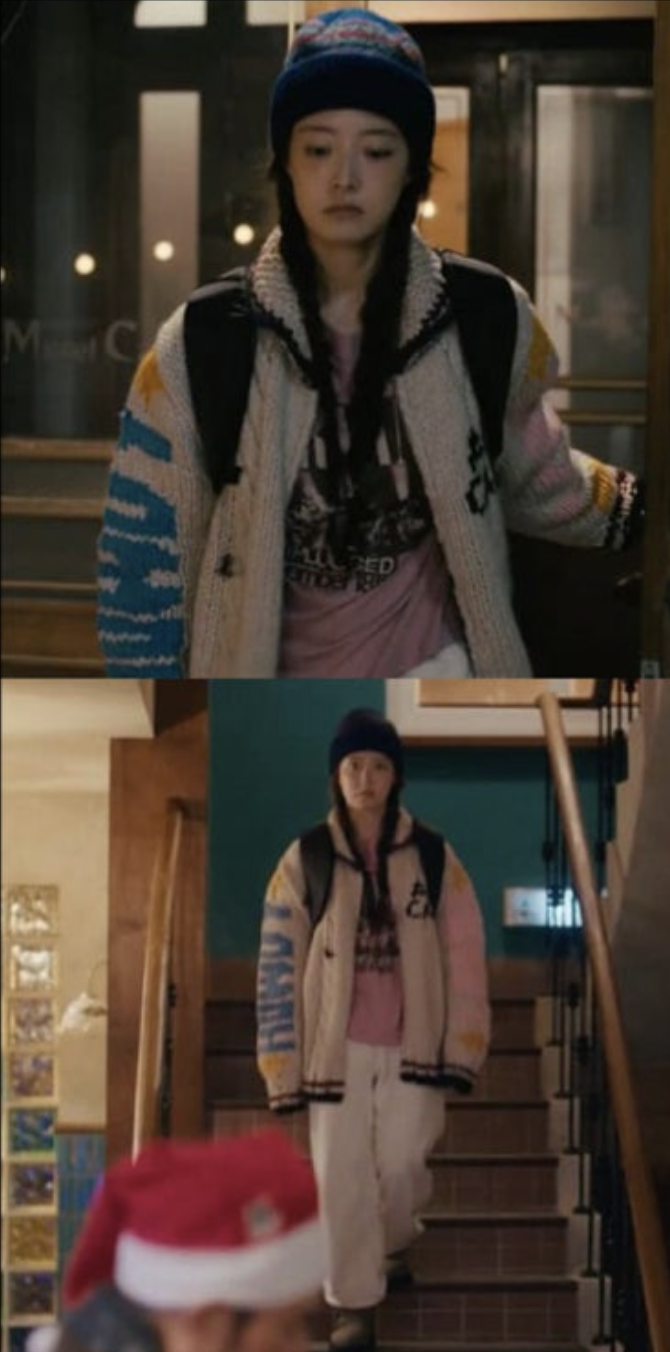 키치한 패턴으로 귀엽고 빈티지한 무드를 동시에 내는 유니크한 집업 니트입니다. 애즈이프 제품으로 등에 귀여운 동물이 그려져 있고, 양 팔에 별이 그려져 있어요. 이세영이 이 집업니트를 착용해서 통통 튀면서 빈티지한 분위기를 낼 수 있었다고 생각해요. 그 정도로 매력적인 제품!