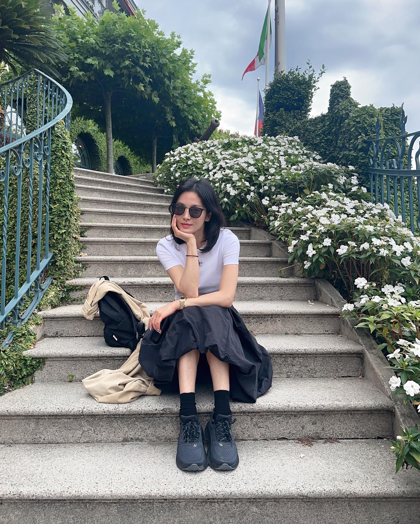 세련된 모습으로 공식 행사를 마친 송혜교는 코모 호수 주변에서 여유를 즐기며 시간을 보냈는데요. 평소 캐주얼하면서도 수수한 룩을 즐기는 그녀답게 티셔츠와 스커트로 심플한 스타일링을 선보였습니다. 펜디 로고가 수놓아진 화이트 티셔츠에 블랙 벌룬 스커트 그리고 뉴발란스 스니커즈를 더해 트렌디한 무드를 더했네요!