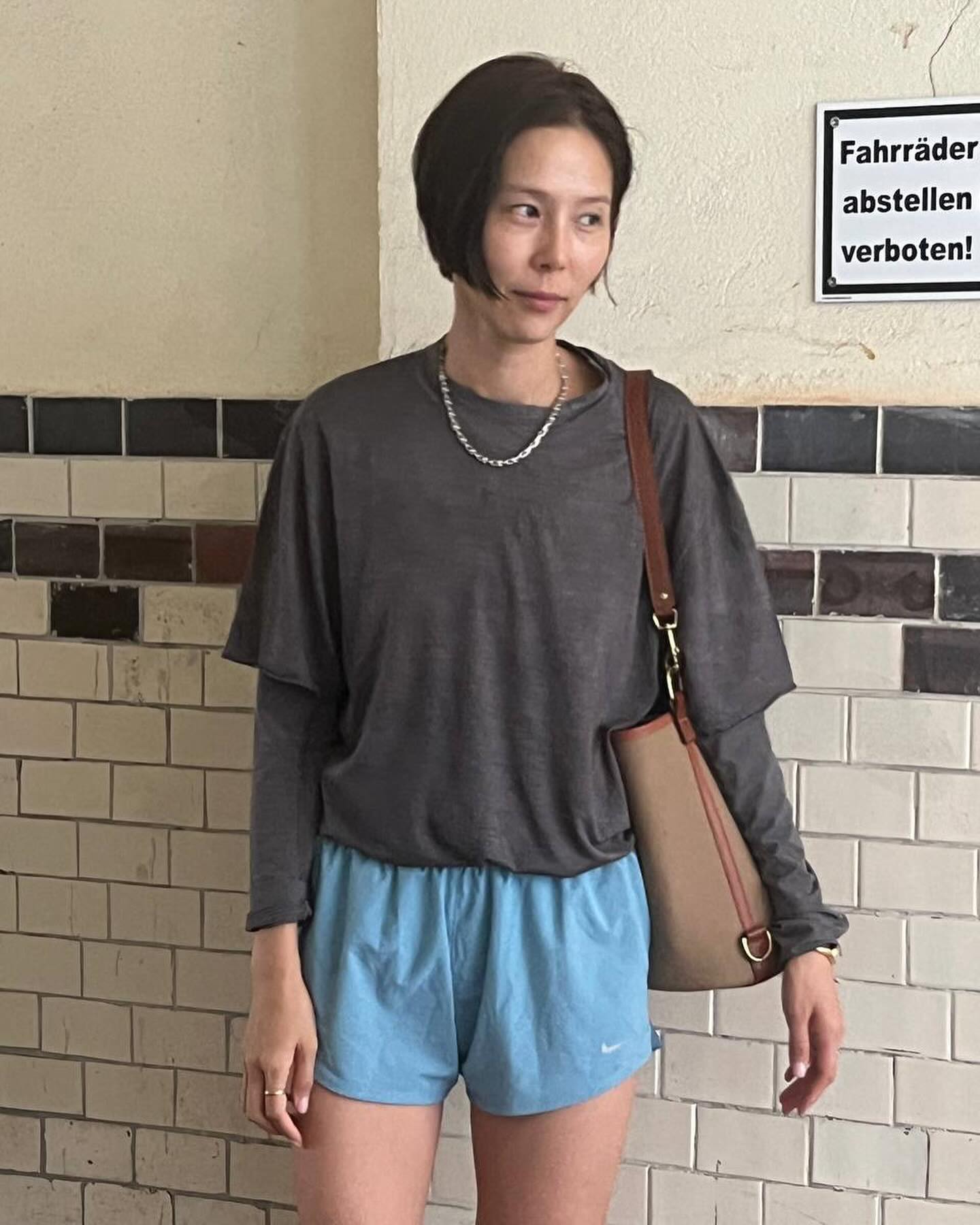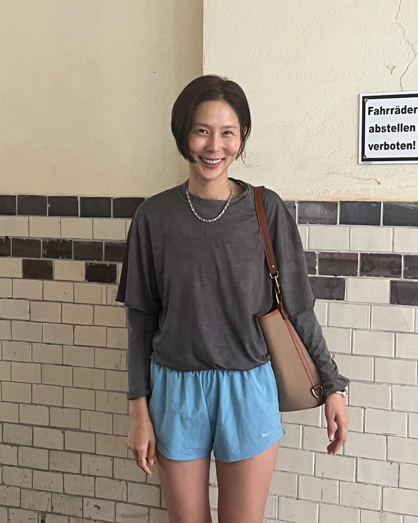 패션 인플루언서 김나영은 그레이 컬러 티셔츠에 데님 터콰이즈 컬러 나이키 우븐 쇼츠를 매치해 스포티한 스타일링을 선보였습니다.