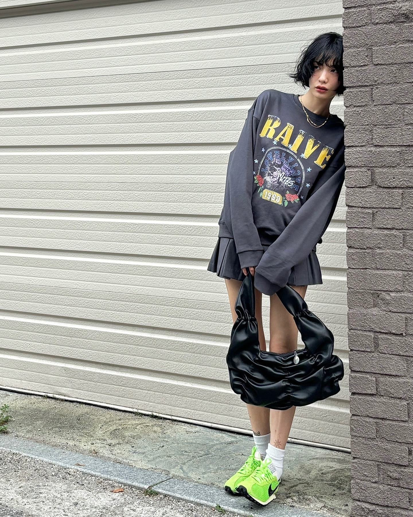긴 생머리도 너무 예쁘지만 스타일리시한 단발로 변신한 나나 또한 색다른 매력이 느껴지는데요. 나나는 평소 여성스러운 스타일보다 털털하면서도 힙한 사복 패션으로도 꽤나 유명합니다. 데일리한 데님 아이템들을 주로 착용하며, 폼이 넉넉한 버뮤다 팬츠 등을 즐겨입는데요. 이번에도 나나는 오버사이즈 맨투맨에 플레어 스커트 그리고 운동화를 매치해 멋스러운 사복 패션을 선보였습니다.