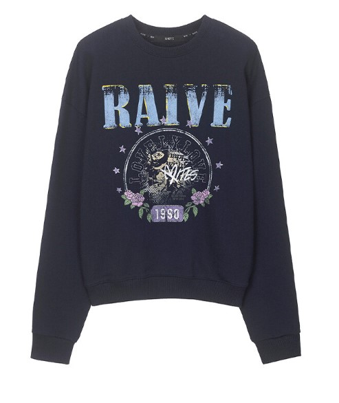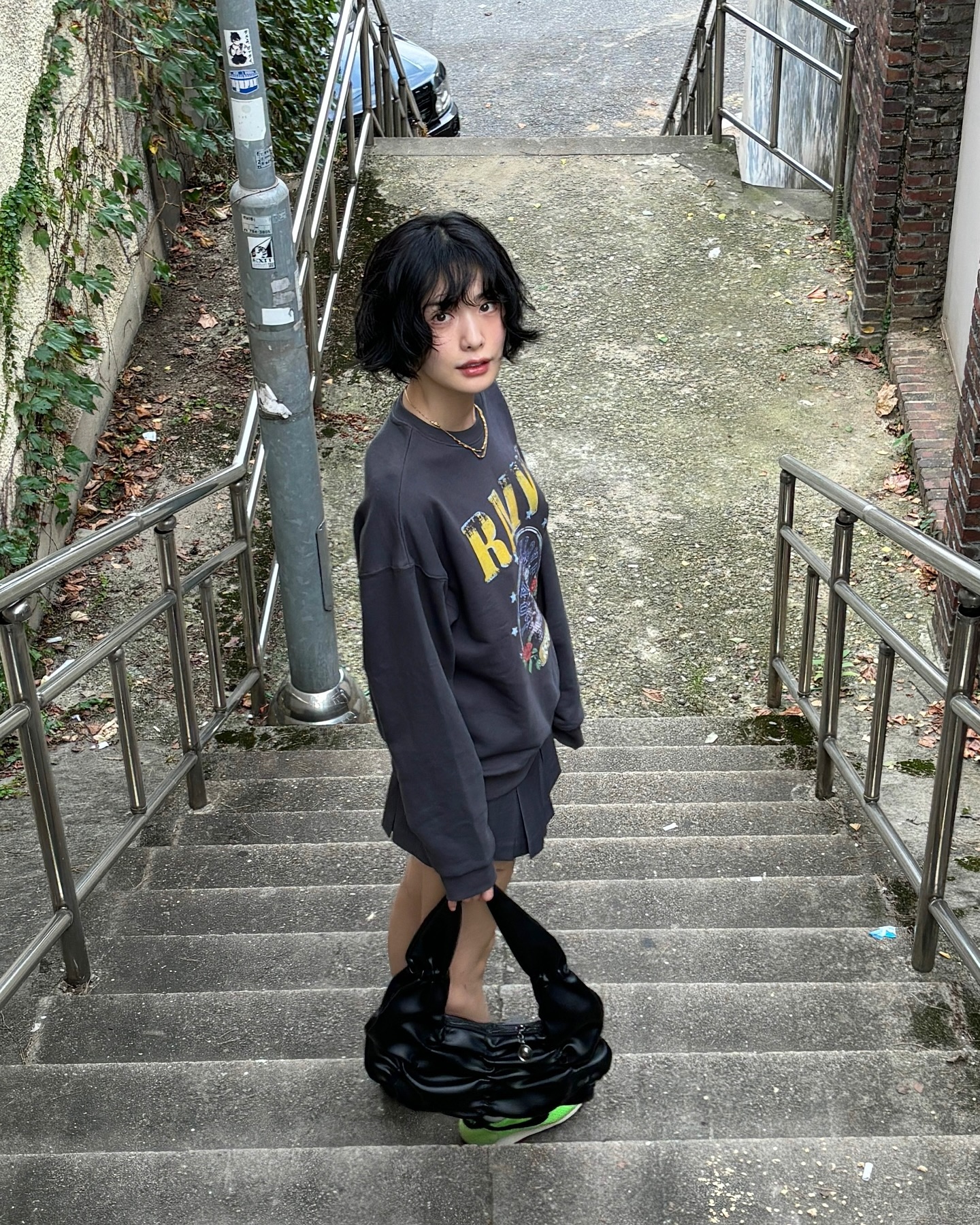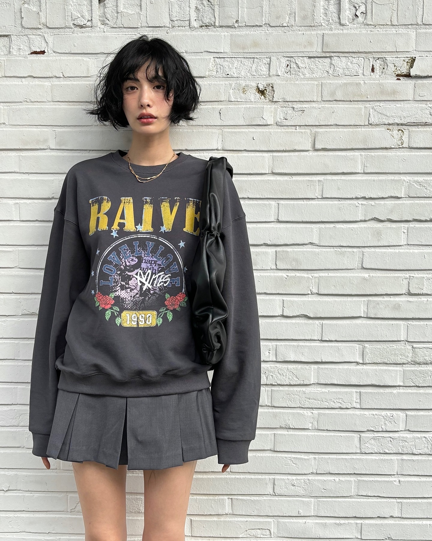 나나의 스타일링 컷에서 알 수 있듯이 빈티지한 무드의 그래픽이 포인트인 제품인데요. 중간 중간 사랑스러운 장미 모티프와 상반된 빈티지한 디테일들의 믹스 매치가 돋보이네요. 나나 또한 레이브 러브바이트 그래픽 맨투맨에 미니 스커트를 더해 러블리한 모먼트를 강조한 걸 확인할 수 있는데요.