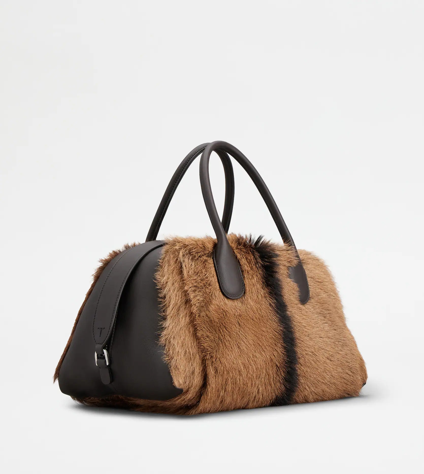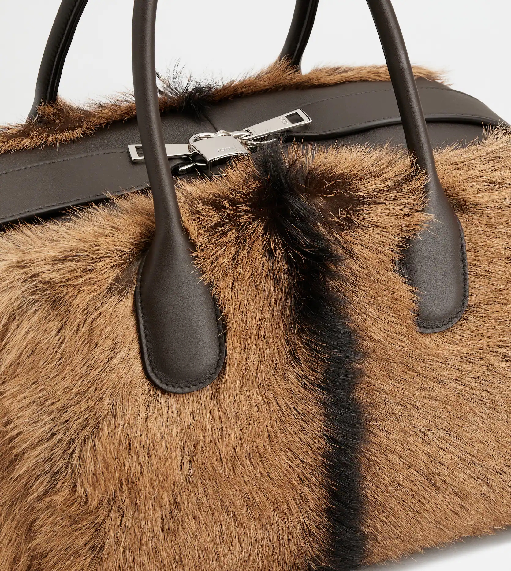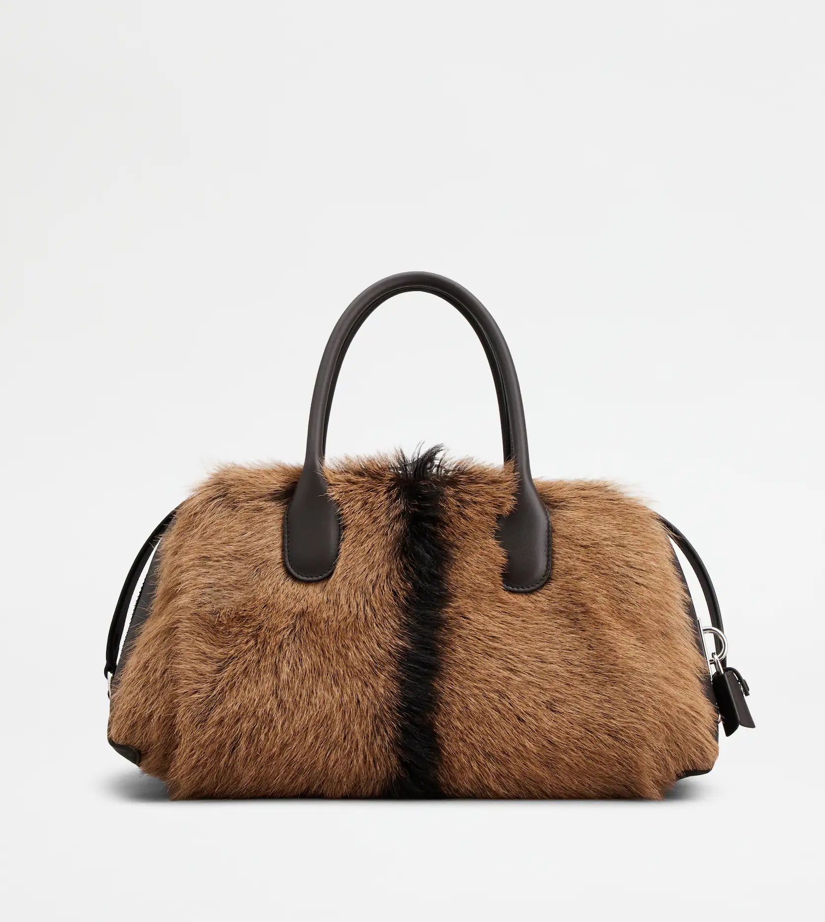 가방에는 전체적으로 브라운 톤의 고트스킨 퍼가 들어가 있으며 중앙에 세로로 들어간 블랙 라인이 심심할 수도 있었던 분위기를 살리고 있죠. 또한 가방 문을 닫았을 때 지퍼를 가져주는 스트랩 디테일로 더욱 세련된 느낌을 더해주고 있습니다.