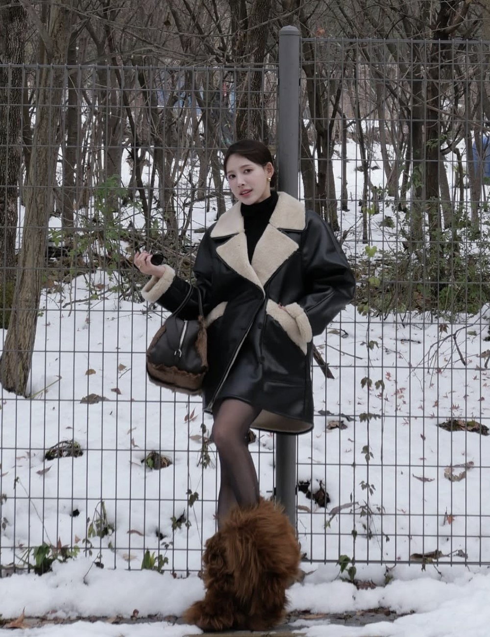 이나연 인스타 사진 룩에서 눈에 띄는 또 하나의 털복숭이 제품이 있죠, 바로 가방입니다. 해당 제품 또한 토즈의 홀리데이 컬렉션 아이템으로 제품명은 ‘다르세나 미디엄’입니다. 차가운 느낌의 가죽 소재 가방들과는 다르게 와일드하면서도 따듯한 분위기를 내는 흔하지 않은 스타일의 가방이죠.