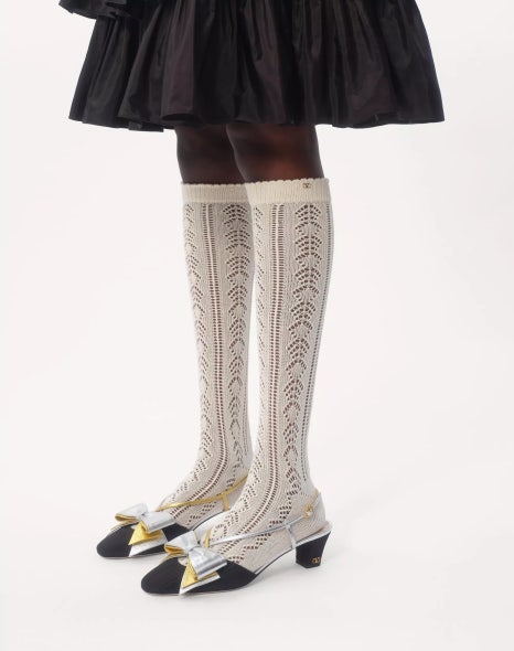 이날 윤아는 양말 또한 발렌티노 제품을 착용하였는데요, 펀칭 패턴으로 표현한 독특한 브이 로고가 눈에 띄는 제품입니다. 엔틱한 무드와 함께 흔하지 않은 디자인으로 모델처럼 발이 드러나는 신발과 착용하였을 때 빛을 발하는 아이템! 사이드에 보이는 작은 발렌티노 시그니처 포인트도 놓치지 마세요