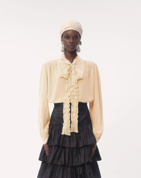 자켓 이너로는 ‘크레이프 드 신 셔츠’를 착용한 것으로 보이는데요, 네크 중앙 부분의 러플 장식과 리본 디테일로 사랑스러운 포인트를 줄 수 있는 아이템입니다.