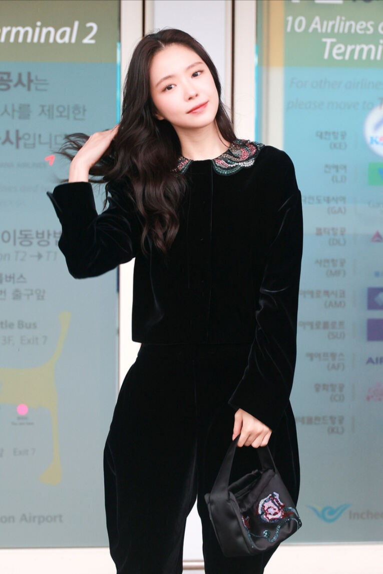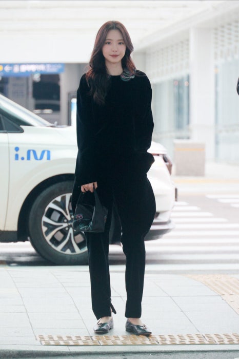 손나은은 얼마전 뉴욕에서 진행된 조르지오 아르마니 2025 S/S 컬렉션 런웨이 및 아르마니 부티크 오프닝 이벤트 참석을 위해 인천국제공항에 등장했습니다. 물론 조르지오 아르마니 착장을 입은 채 말이죠! 이 날 손나은은 고급스러운 느낌이 물씬 풍기는 벨벳 소재 탑과 팬츠 그리고 플랫슈즈를 매치해 시크하면서도 모던한 분위기를 연출했습니다.