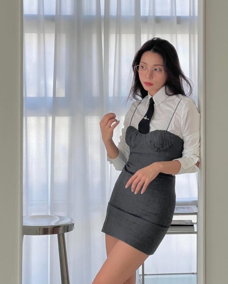 심플하고 깔끔한 화이트 셔츠는 뷔스티에나 크롭 톱과 궁합이 매우 좋은 편이다.
