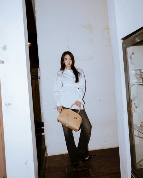 안소희 또한 적당한 오버핏 화이트 셔츠에 블랙 팬츠를 더해 우아하고 고급스러운 아웃핏을 선보였다. 이처럼 약간의 광택 디테일이 추가되어 있으면서 허리 핏을 잡아주는 독특한 디자인의 셔츠는 유니크하면서도 여성스러운 스타일 연출을 도와주는 편. 베이식하고 심플한 기본 화이트 셔츠가 많다면, 이처럼 독특한 디자인의 아이템을 선택해 보는 것도 추천한다.