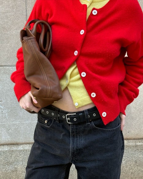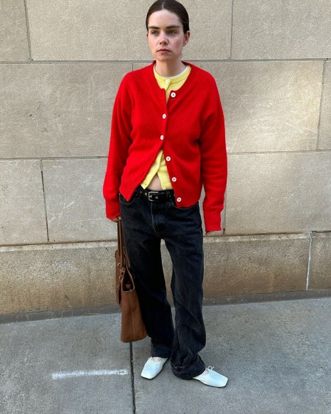 패션 인플루언서 '리즈 블러스타인'은 가장 베이직한 디자인의 단추 카디건 두 개를 레이어드해서 입었어요. 일반적인 레이어드 방법이 아니기 때문에 아웃핏이 더 신선해보입니다. 단추를 끝까지 잠그지 않은 센스가 돋보이죠. 개인적으로 짱구가 생각나는 컬러인데 ㅎㅎ 빨강과 노랑이 이렇게 상의에서 동시에 귀엽게 레이어드 되는 컬러인걸 또 처음 알았네요~~~
