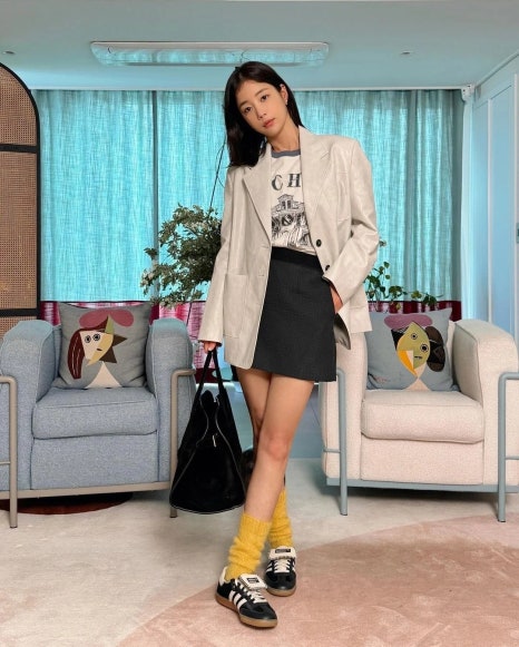 운동화의 길게 빠져 나온 텅 부분이 매력적인 이 제품은 트렌디하면서도 멋스러운 스타일을 완성해준다. 기은세처럼 미니스커트와 함께하면 사랑스러운 느낌을, 단정하고 깔끔한 슬랙스와 함께하면 스타일링 포인트용으로도 손색 없을 것.
