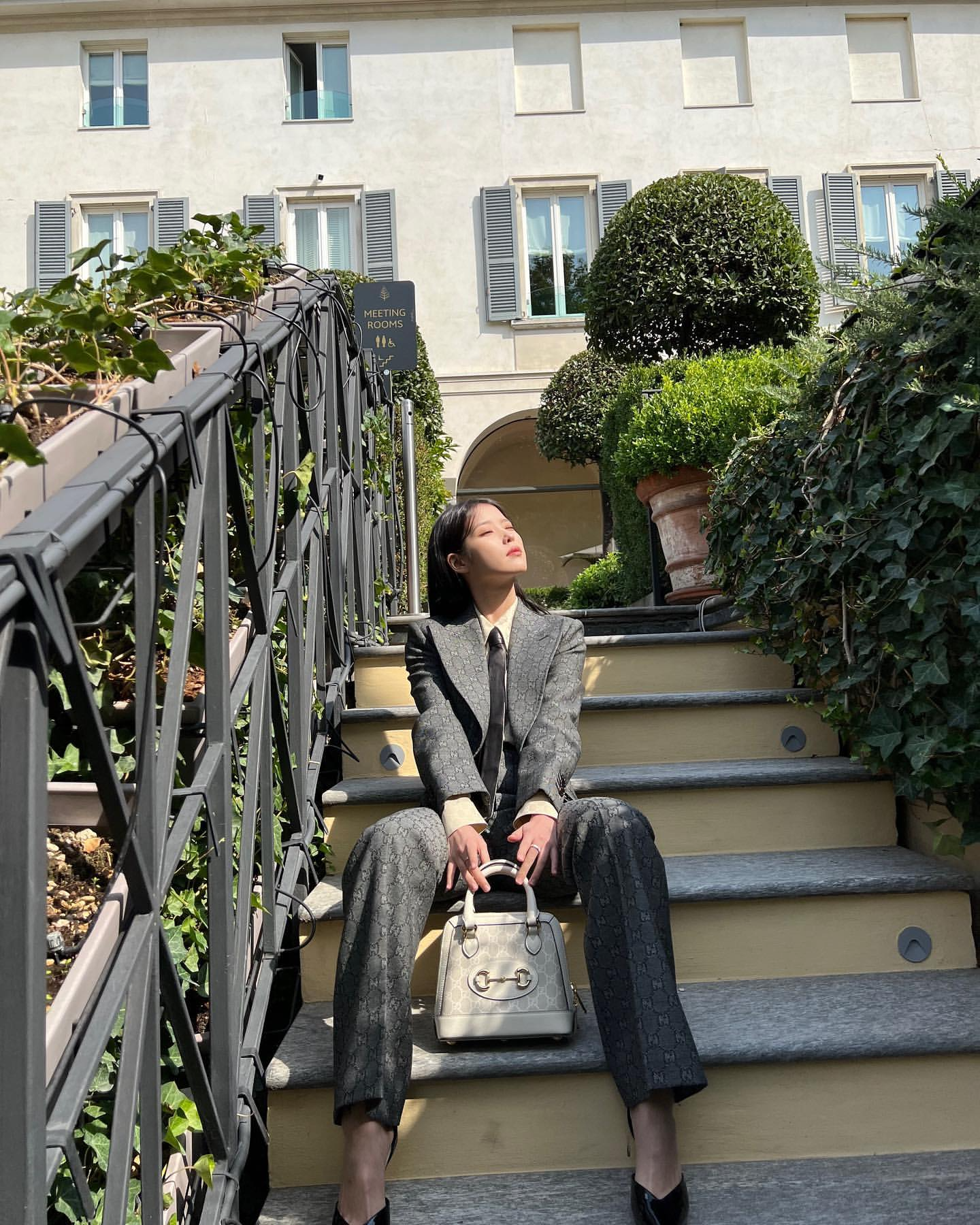 대한민국을 넘어 명품 브랜드 구찌의 글로벌 앰배서더로 활발히 활동 중인 아이유는 구찌 트윈스버그 패션쇼에서 시니컬하면서도 매니쉬 한 슈트 룩을 선보였다. 포켓 및 버튼 디테일이 특징인 구찌 셋 업과 함께 매치한 클래식한 가방 역시 구찌제품.