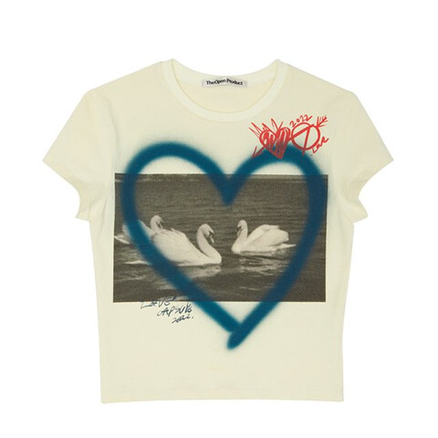 더 오픈 프로덕트 러브 베이비 티셔츠는 앞면에 시즌 그래픽과 로고 프린팅 그리고 스프레이 작업이 포인트다. 티셔츠 한 장만으로도 개성 있는 스타일링이 가능하다. 뿐만 아니라 크롭 한 기장감으로 하이웨스트나 롱 스커트와 함께 매치하기 좋으니 참고해 둘 것.