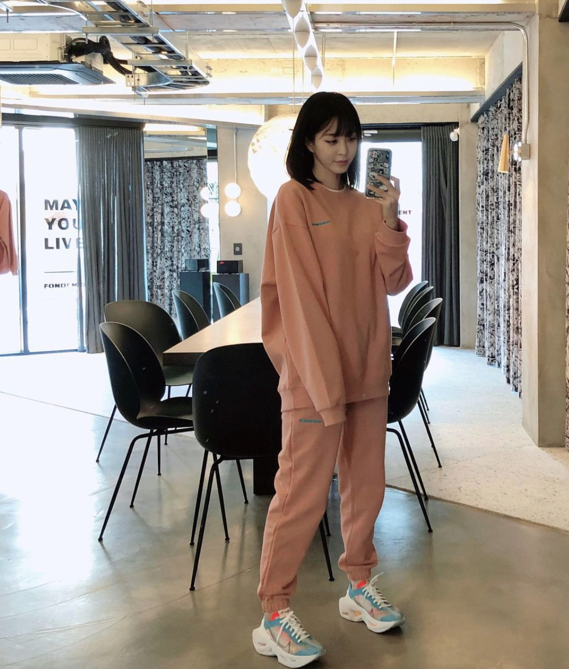 사실 조거팬츠와 맨투맨 조합은 실패할 수 없다. 한예슬은 파스텔 톤의 조거팬츠와 맨투맨을 세트로 착용해 편안하면서도 사랑스러운 룩을 완성하였다. 기은세 역시 요즘 핫한 스트레치 엔젤스 트레이닝 세트와 화이트 스니커즈를 활용했다.