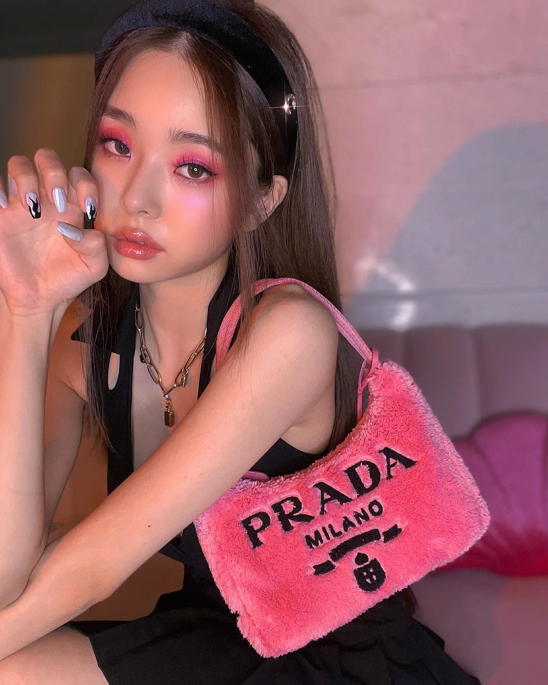 겨울에 더욱 빛을 발휘하는 뽀글뽀글 시어링 한 무드의 가방들. 유명한 패션 뷰티 인플루언서 프리지아는 블랙 컬러로 상, 하의를 맞춘 뒤 선명한 페탈 핑크 컬러 호보백을 착용해 시니컬하면서도 트렌디한 아웃핏을 선보였다. 프리지아가 착용한 가방은 일명 "뽀글이 가방"이라고 불리는 이 가방의 정체는 프라다 리에디션 테리 호보백.